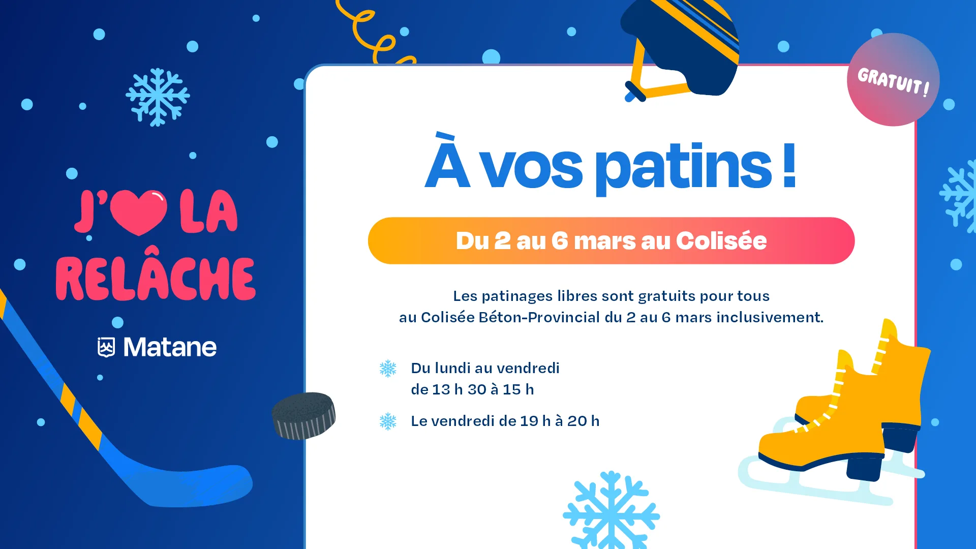 À vos patins! Patinage intérieur. Les patinages libres sont gratuits pour tous du 2 au 6 mars inclusivement.