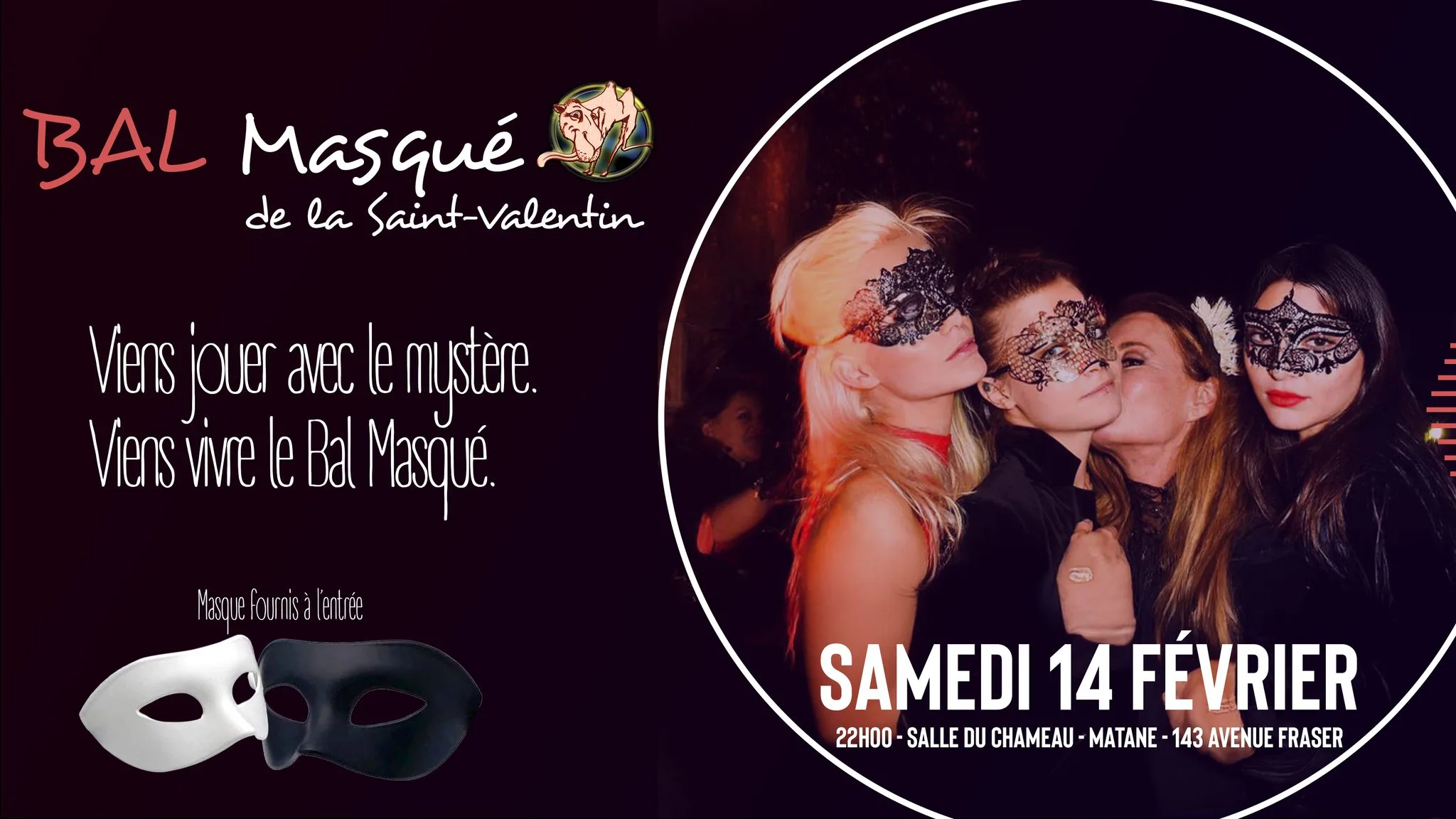 Bal masqué de la Saint-Valentin, le samedi 14 février dès 22 h, à la salle du Chameau à Matane.