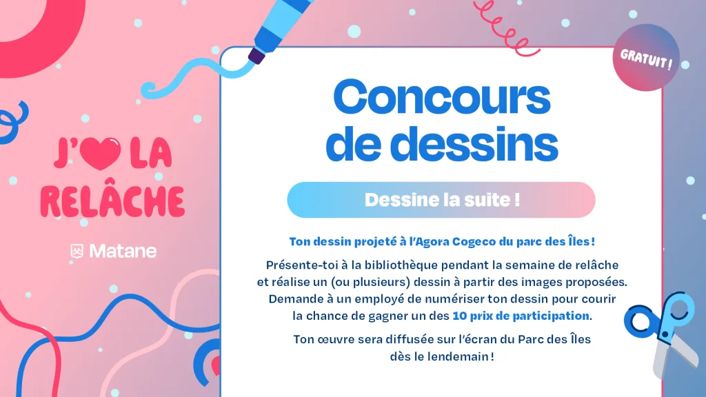 Présente-toi à la bibliothèque pendant la semaine de relâche et réalise un (ou plusieurs) dessin à partir des images proposées. Demande à un employé de numériser ton dessin pour courir la chance de gagner un des 10 prix de participation. Ton œuvre sera diffusée sur l’écran du Parc des Iles dès le lendemain!