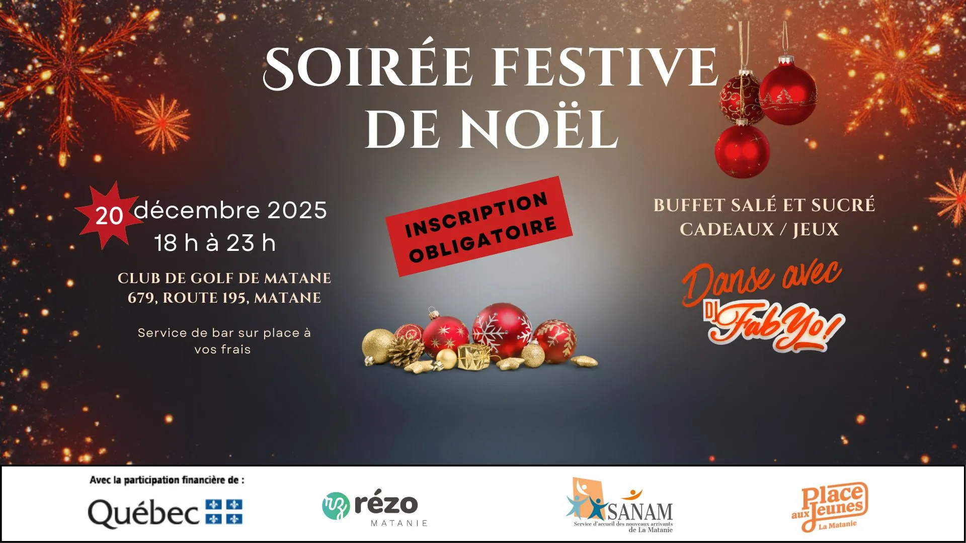 Samedi 20 décembre de 18 h à23 h au Club de golf de Matane, 679 QC-195, Matane, QC G4W 3M7.